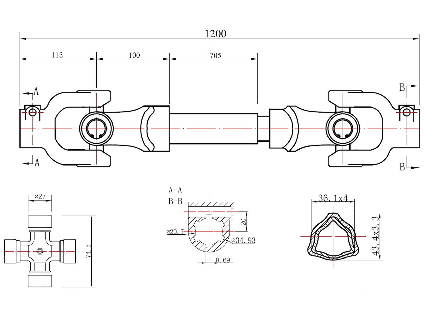 Kardántengely 120cm T-cső